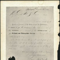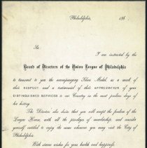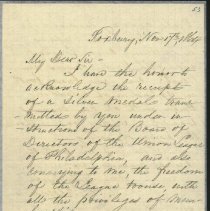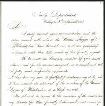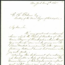 The Union League of Philadelphia awarded silver medals from 1863 to 1991. The Union League Silver Medal, one of the "medals of honor" of the Union League, is awarded to civic leaders of distinction who, through their actions, demonstrated a high degree of patriotism and made significant contributions to the United States of America. Many of the first awardees were Union officers during the Civil War or individuals who made significant contributions to the Union cause during the Civil War. There is some discrepancy between the official list of awardees, the names inscribed on some of the medals, and the owners of some of the medals. The reason for this is unclear. In 1991, The Union League of Philadelphia Silver Medal was renamed the Lincoln Award. The Union League of Philadelphia Gold Medal and The Union League of Philadelphia Silver Medal were struck from the same die. There are many examples of the Silver Medal in the collection, with slight variations in the obverse, reverse, and suspension, but many characteristics in common. The circular medals have, on the obverse, a row of stars along the edge surrounds the text "UNION LEAGUE / JULY 4'TH / 1776 / 1863 / PHILADELPHIA." In the center, there is a stars and stripes shield with a ribbon across inscribed, "E PLURIBUS UNUM." On the reverse, a row of stars along the edge surrounds the text "ORGANIZED / DECEMBER / 27TH / 1862" or "ORGANIZED / PHILADELPHIA / DECEMBER / 27'TH / 1862." Sometimes the text covers the entire reverse, sometimes the text is only along the edge with the name of the awardee inscribed in the center, and sometimes the entire reverse is blank. The medals are attached to variations of a grosgrain red, white, and blue striped ribbon. In 1966, Senator Everett M. Dirkson, Illinois, became the last recipient of the original design of The Union League of Philadelphia Silver Medal. In 1968, the Union League debuted a new design for its medals of honor. The obverse of the circular medal features an eagle and a stars and stripes shield over "1862", surrounded by "THE UNION LEAGUE OF PHILADELPHIA" and stars. The reverse has "LOVE OF COUNTRY LEADS" and stars around the edge, with a blank center. This medal also increased in size from 1.25" in diameter to 2.125" in diameter. In 1989, because "a great deal of confusion exist[ed] between the Gold and Silver Medals," the Union League's Ad Hoc Committee on Medals & Awards recommended replacing the Silver Medal with the Lincoln Award, which would replicate the sculpture of Abraham Lincoln by Jakob Otto Schweizer on display in the Lincoln Memorial Room in the Union League. The first Lincoln Award was presented in 1991. Sources: The Union League of Philadelphia Archives "Chronicle of The Union League of Philadelphia: 1862-1902," printed for The Union League by Wm. F. Fell & Co., Philadelphia. Memo from Robert W. Miller, Chairman, Ad Hoc Committee on Medals & Awards, to Edward L. Jones, Jr., President, Union League of Philadelphia, November 30, 1989, from The Union League of Philadelphia Archives. "The Union League of Philadelphia: The First 150 Years" by Barbara J. Mitnick, published by The Abraham Lincoln Foundation of The Union League of Philadelphia, 2012. The Union League of Philadelphia Silver Medal Recipients 1863 Vice President Hannibal Hamlin Secretary of State William H. Seward Secretary of the Treasury Salmon P. Chase Secretary of War Edwin M. Stanton Secretary of the Navy Gideon Welles Secretary of the Interior John P. Usher Postmaster General Montgomery Blair Attorney General Edward Bates Major General Nathaniel P. Banks, U.S. Army Major General Benjamin F. Butler, U.S. Army Major General Henry W. Halleck, U.S. Army Major General Ulysses S. Grant, U.S. Army Major General Irwin McDowell, U.S. Army Major General Ambrose E. Burnside, U.S. Army Major General William S. Rosecrans, U.S. Army Major General William T. Sherman, U.S. Army Major General Joseph Hooker, U.S. Army Major General George G. Meade, U.S. Army Major General George Cadwalader, U.S. Army Major General Franz Sigel, U.S. Army Major General Darius N. Couch, U.S. Army Major General Napolean J.T. Dana, U.S. Army Major General Quincy A. Gillmore, U.S. Army Brigadier General Lorenzo Thomas, U.S. Army Surgeon General William A. Hammond, U.S. Army Colonel George H. Crosman, U.S. Army Brigadier General Montgomery C. Meigs, U.S. Army Brigadier General William D. Whipple, U.S. Army Governor Andrew G. Curtin, Pennsylvania Admiral David G. Farragut, U.S. Navy Admiral David D. Porter, U.S. Navy Admiral John C. Dahlgren, U.S. Navy Captain John Lorimer Worden, U.S. Navy Admiral Andrew Hull Foote, U.S. Navy Monsieur Gueroult Comte de Gasparin M. de Laboulaye M. Malespine John Elliot Cairnes John Bright Richard Cobden M. Tersten William E. Foster Robert Trimble William L. Dayton John Stuart Mill Josiah Quincy Charles Francis Adams 1864 Major General Winfield S. Hancock, U.S. Army Major General Philip H. Sheridan, U.S. Army Major General George H. Thomas, U.S. Army Captain John A. Winslow, U.S. Navy Commodore Charles Boggs, U.S. Navy Lieutenant Commander William B. Cushing, U.S. Navy Washington Wilks, Editor, London Star Samuel Lucas, Editor, London Star Baron Jacob Cederstrom F. William Sargent, M.D. Professor Goldwin Smith Ishmael Day 1865 Hugh McCullough Major General Alfred H. Terry, U.S. Army Major General A. A. Humphreys, U.S. Army Major General John Gibbon, U.S. Army Lieutenant Colonel Count Warburg 1866 Major General Joseph Holt, U.S. Army 1955: General Jack L. Devers, U.S. Army 1964: General Wallace M. Greene, Jr., U.S. Marine Corps 1966: Governor William W. Scranton, Pennsylvania 1966: Senator Everett M. Dirkson, Illinois 1968: Lieutenant General Milton G. Baker, U.S. Army 1970: Dr. Kenneth Dale Wells 1970: Captain Charles Conrad, Jr., U.S. Navy, Astronaut 1984: General Paul X. Kelly, U.S. Marine Corps 1987: Admiral William J. Crowe, Jr., U.S. Navy, Chairman of the Joint Chiefs of Staff 1989: Secretary of State George P. Sc